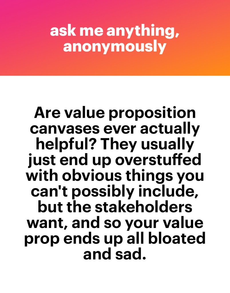 (This post is partially inspired by a person, who, when I recommended a messaging exercise to sharpen their painfully generic value proposition, told me that wouldn’t be necessary: the company already had one, it was all there on paper. And if I really needed to tweak it, which they doubted, to do it based on some desk research, and not rock any boats. After all, their customers and SMEs were too important to speak to some random marketing lady. I hope the fact that they “deliver Digital Transformation”, “strive for excellence” and “tailor their services to customer needs” strikes a chord with their audience.)